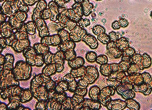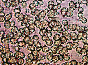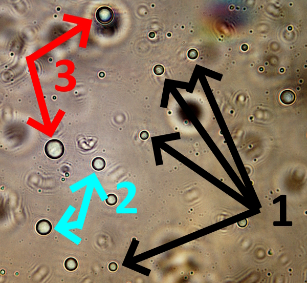 In these photographs, the focus is deliberately and slightly skewed to improve visibility of the phenomenon. Each small circular entity (approx. 0.5 microns) corresponds primarily to the synthetic biology (CDB) form.