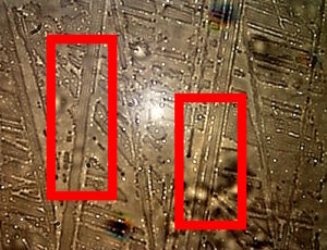 What is occurring here is a view on the underside of the cover slip. One might be inclined to interpret a slide liquid artifact here (even that would be difficult), but this does not prove to be the case. The phenomenon remains as the slide is dry. A proposed mechanism here involves a charge separation and charge organization within a network scenario. The grids formed are not always perpendicular and can be single axis as shown; furthermore skew angles can develop but the grid nevertheless remains with a level of parallel and uniform spacing. The core unit of the grid development is the synthetic biology (CDB).