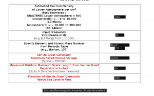 A web based calculator for estimating lower atmospheric magnetic properties is included on this page. By plugging values of electron density, ELF range, element and atomic mass number, and Van de Graaf spark length, this calculator estimates electromagnetic properties of the lower atmosphere, including predicted Whistler frequency, Alfven wave frequency, plasma frequency, lower atmospheric conductivity and more. Mathematical calculations for manually calculating these same values are included in a discussion also on this page.