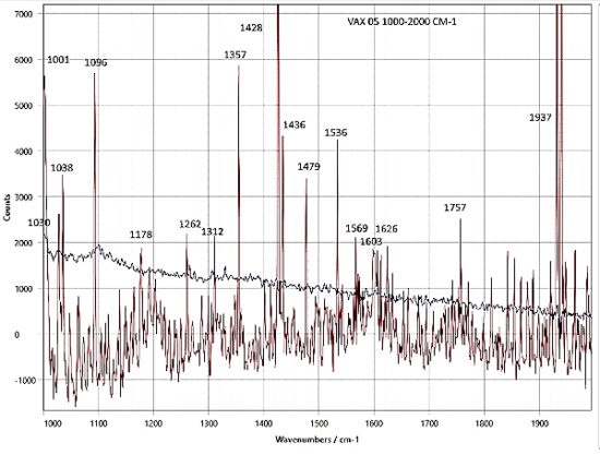 2. The second deviation from the UNVAXXED set spectrum occurs with a shift from approx. 1155 cm-1 to an approx. 1178 cm-1 in the VAXXED set spectra. Any deviation beyond three standard deviations (sigma = 2.6 cm-1) of instrumental variation is considered worthy of mention.